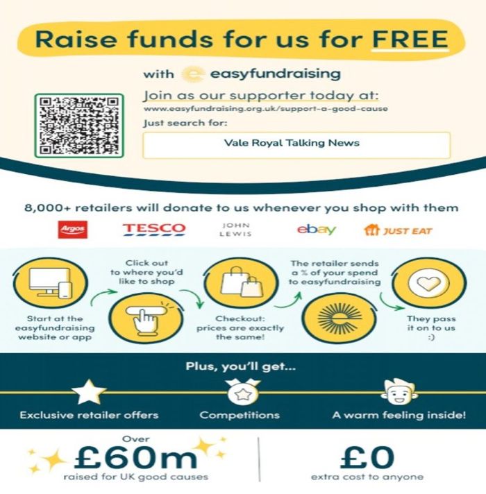 Just click on the link to set up an account with Easy Fundraising and then select Vale Royal Talking News as your selected cause. Then when you do on-line shopping with a wide variety of outlets, Easyfundraising will donate to VRTN at absolutely no cost to you.